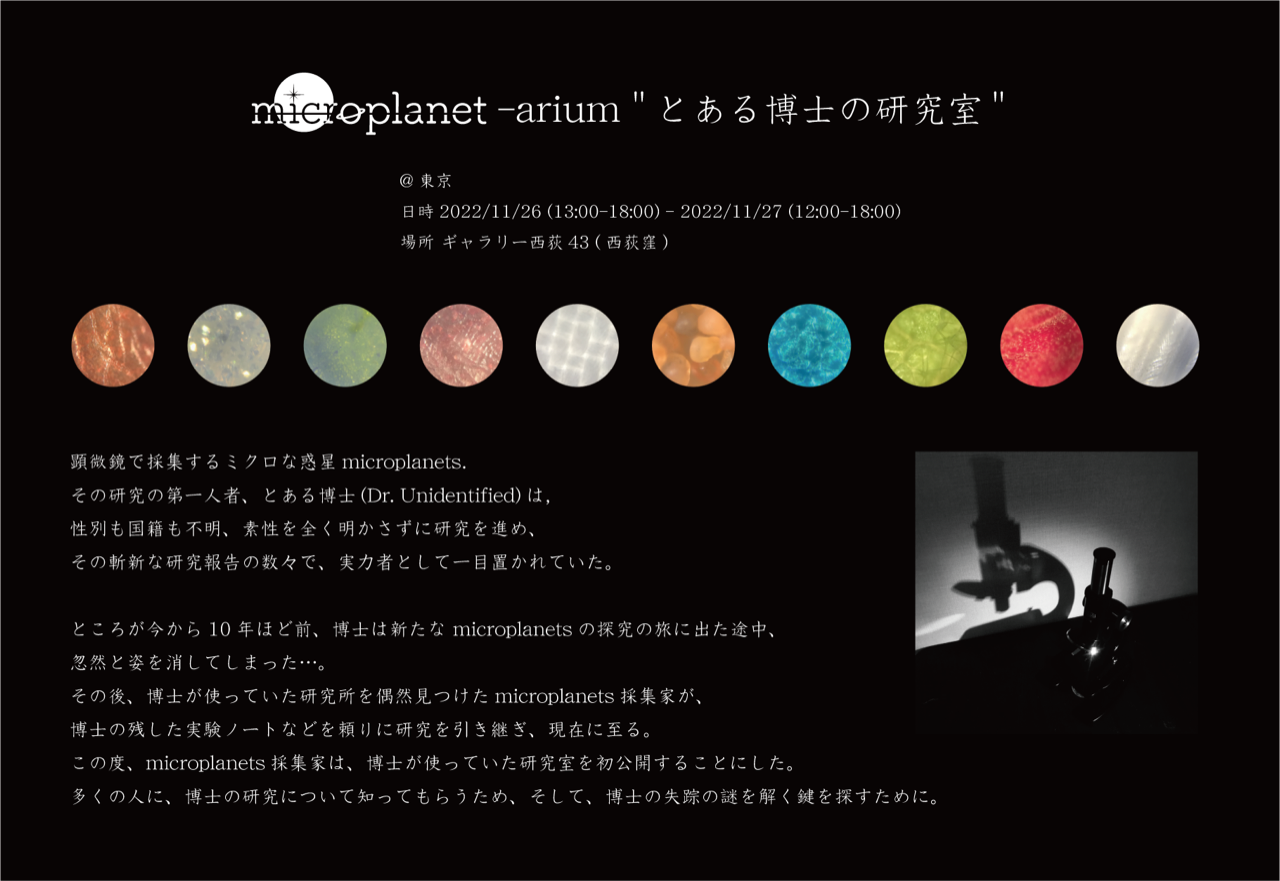 microplanetsの研究の第一人者で、正体不明な「とある博士」が実験していた研究室の様子を見て、研究の謎に迫ろうという、謎解き要素の入った展示です。実際に謎解きをしながら展示をお楽しみいただけます。(そんなに難しいものでもないのでご安心を!)