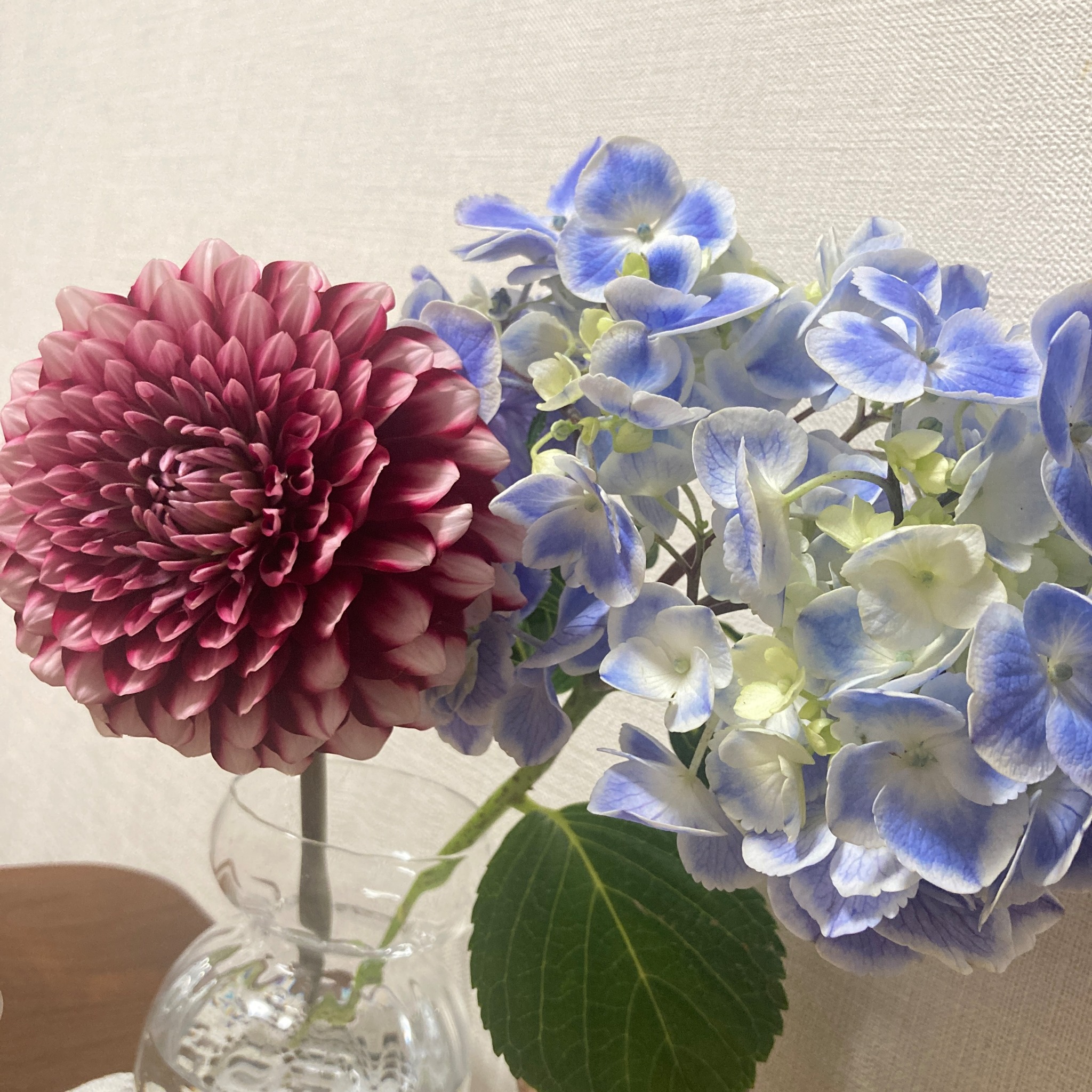 濃い赤と白のグラデーションが美しいダリアと,アジサイ.